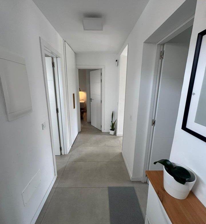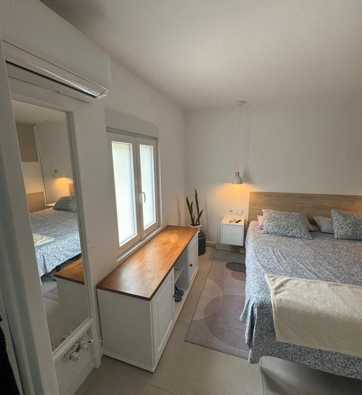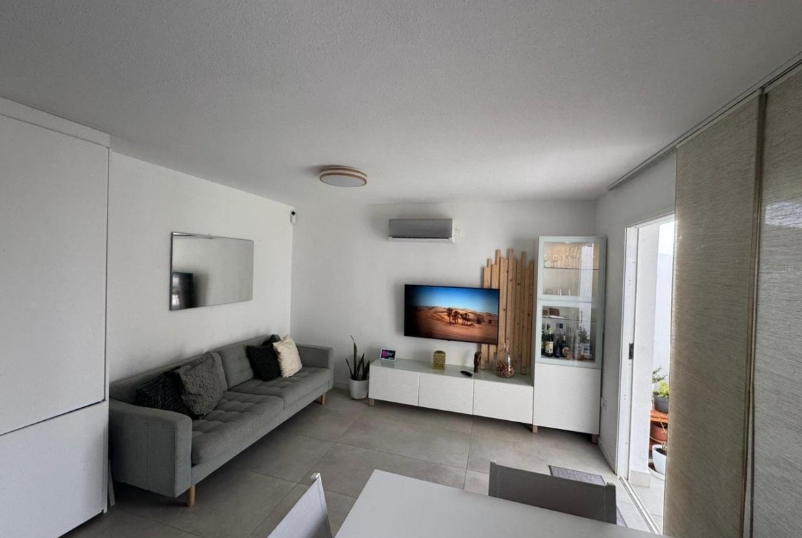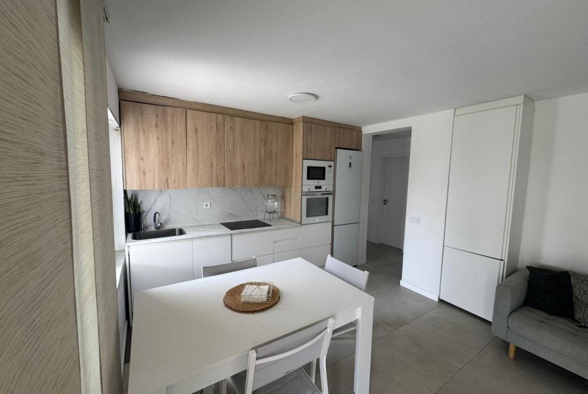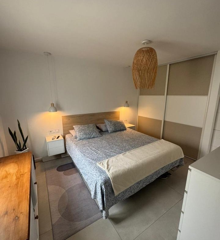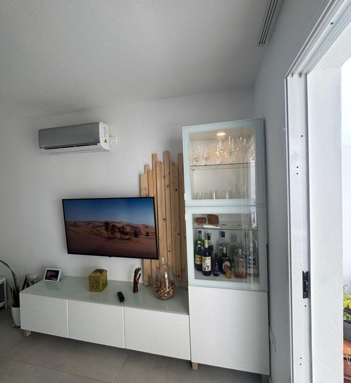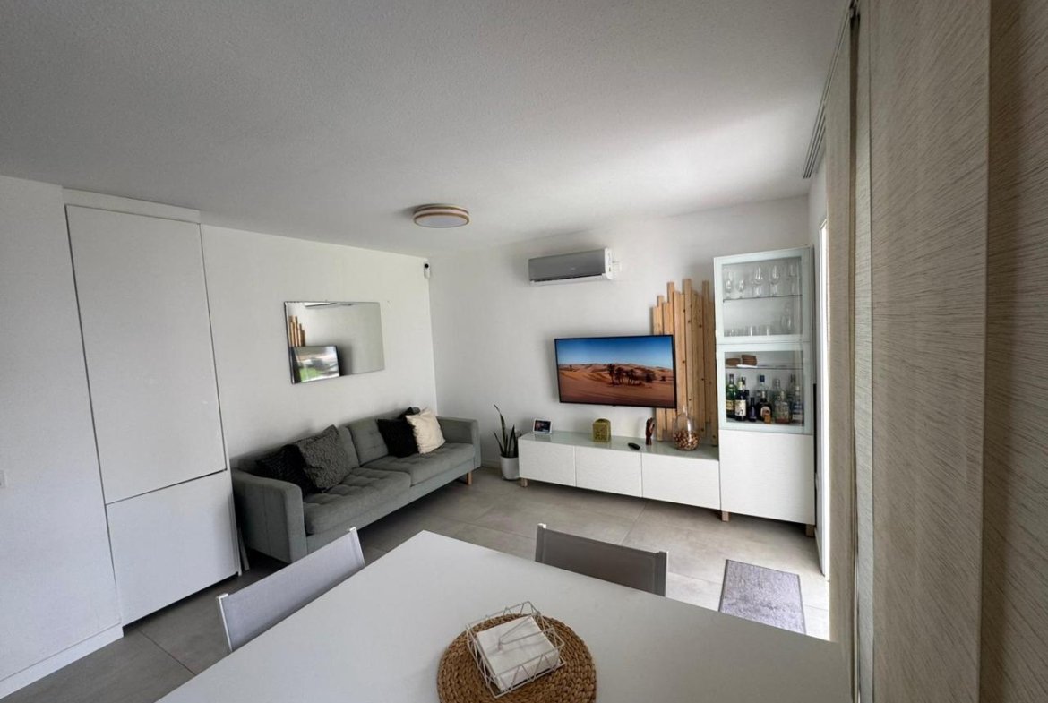 La propiedad cuenta con 2 dormitorios y 2 baños (uno de ellos en suite), cocina abierta totalmente equipada, luminoso salón y una amplia terraza con pérgola bioclimática y zona de comedor exterior. Además, dispone de solárium privado, aire acondicionado en todas las estancias y 2 plazas de aparcamiento frente al apartamento.