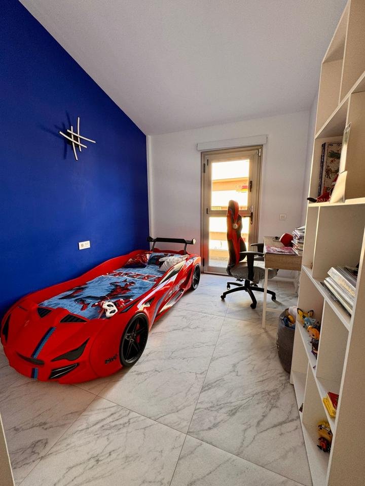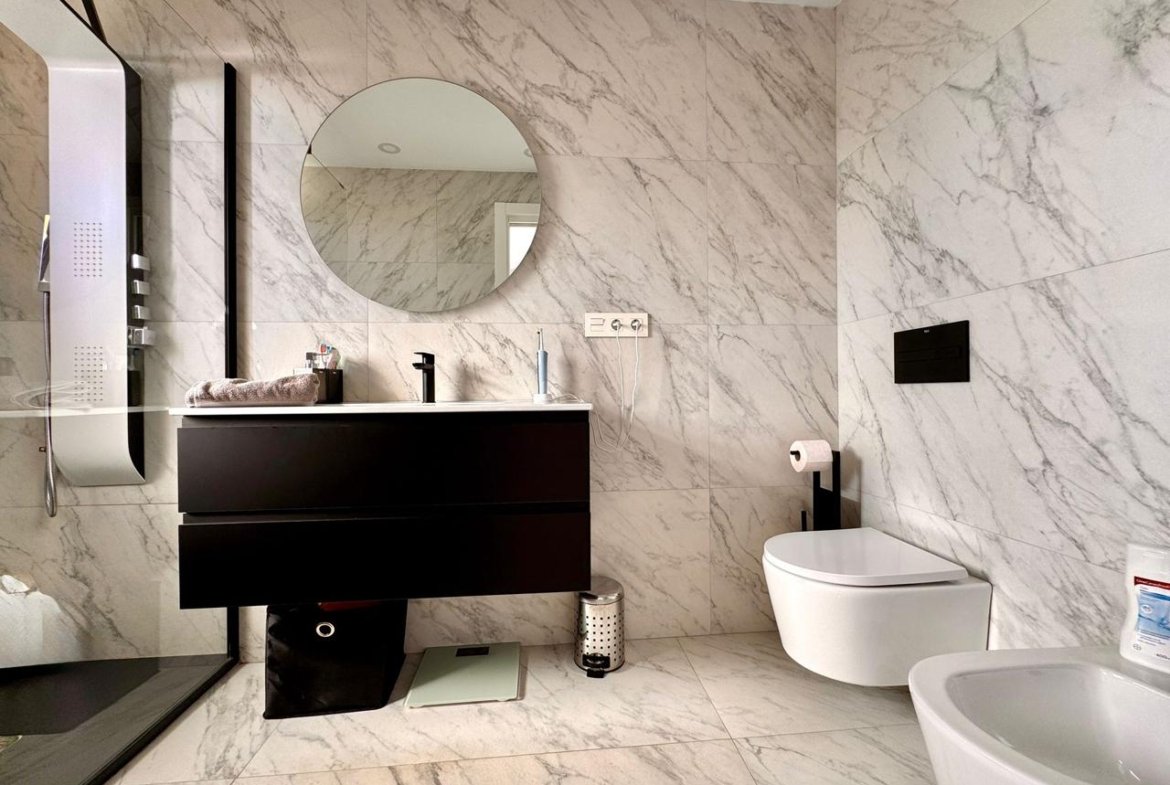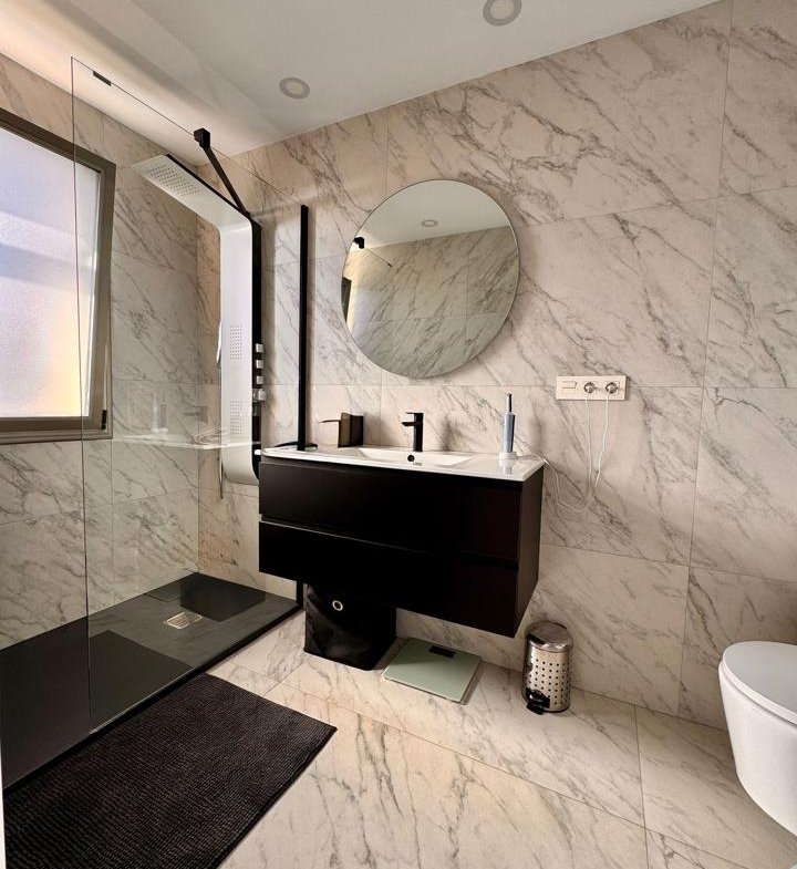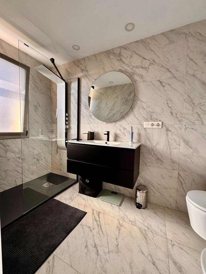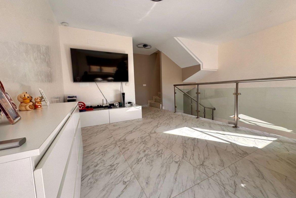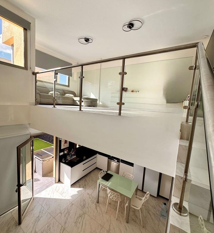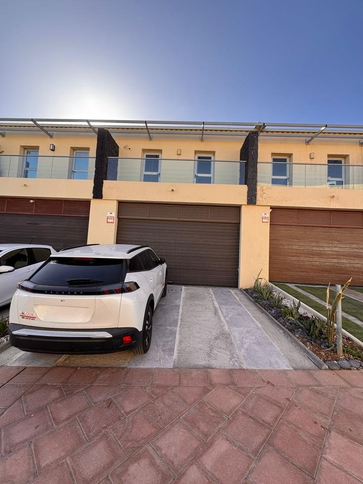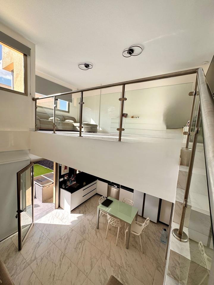 La vivienda, de estilo moderno y líneas limpias, se distribuye en tres niveles con una superficie total construida de 192 m² sobre una parcela del mismo tamaño. Cuenta con tres dormitorios, tres baños completos (uno en suite), un luminoso salón con cocina integrada de concepto abierto y una acogedora terraza privada, ideal para relajarse con vistas parciales al océano.