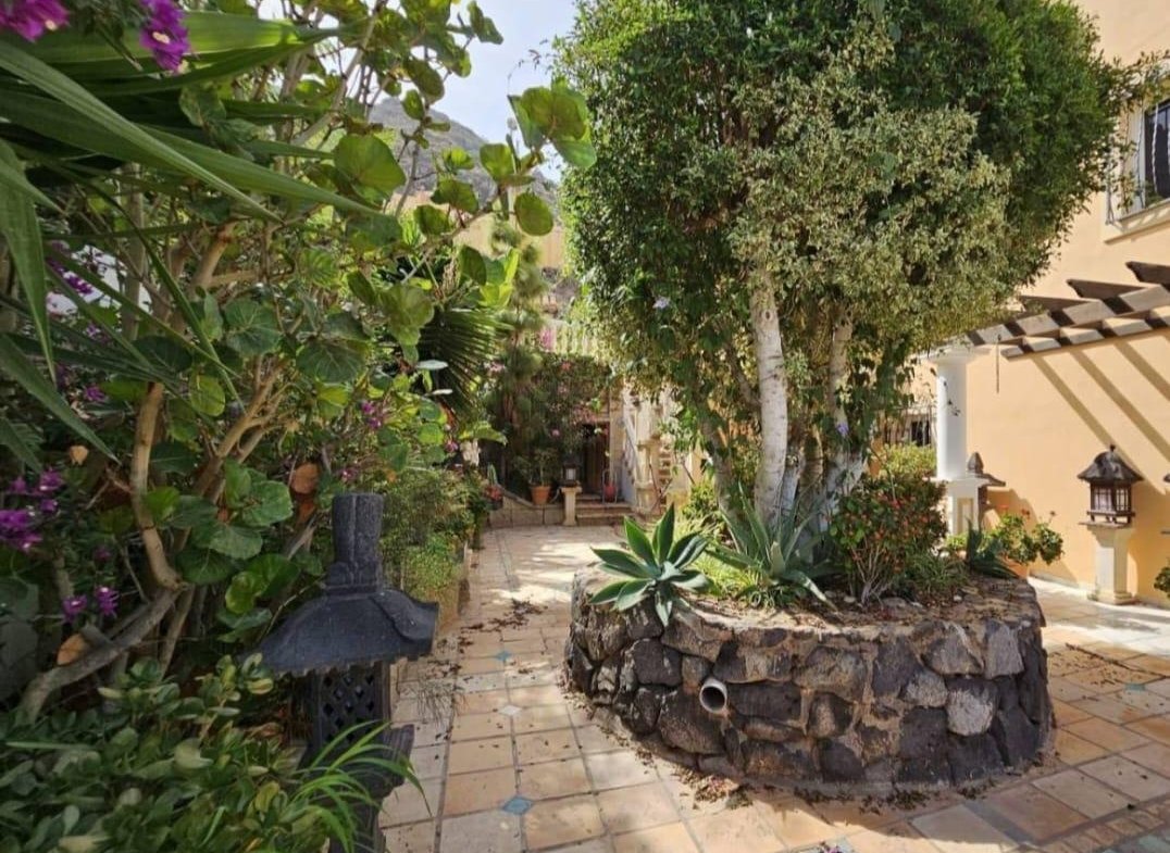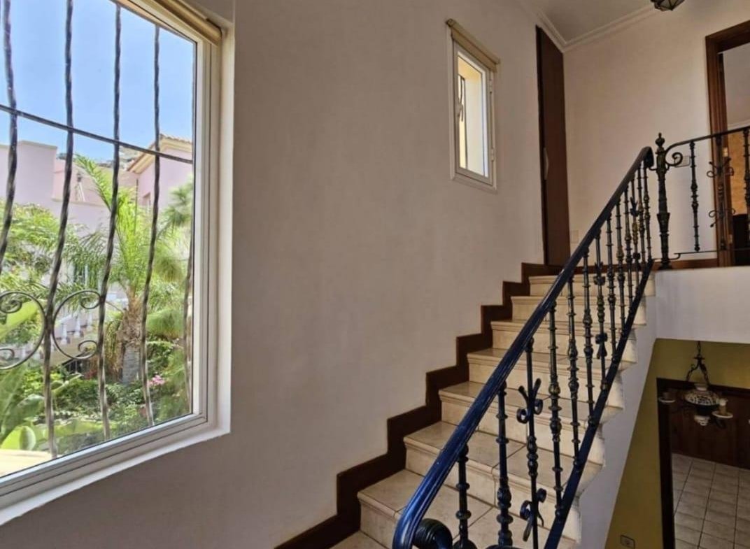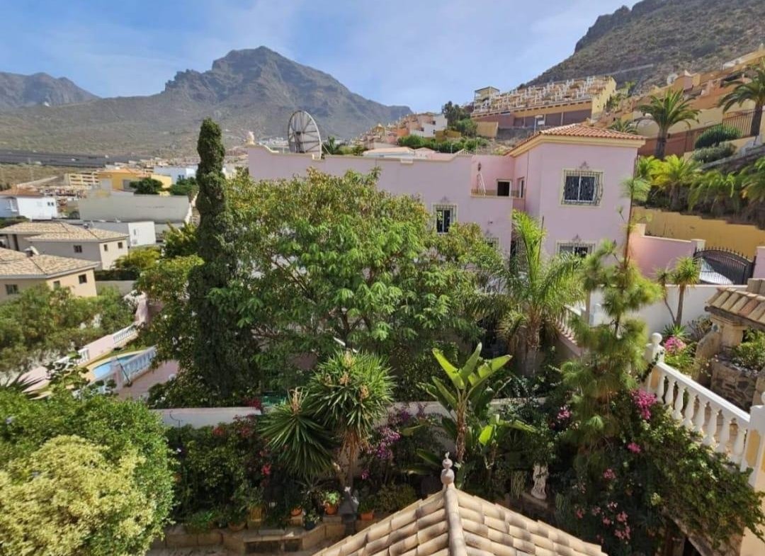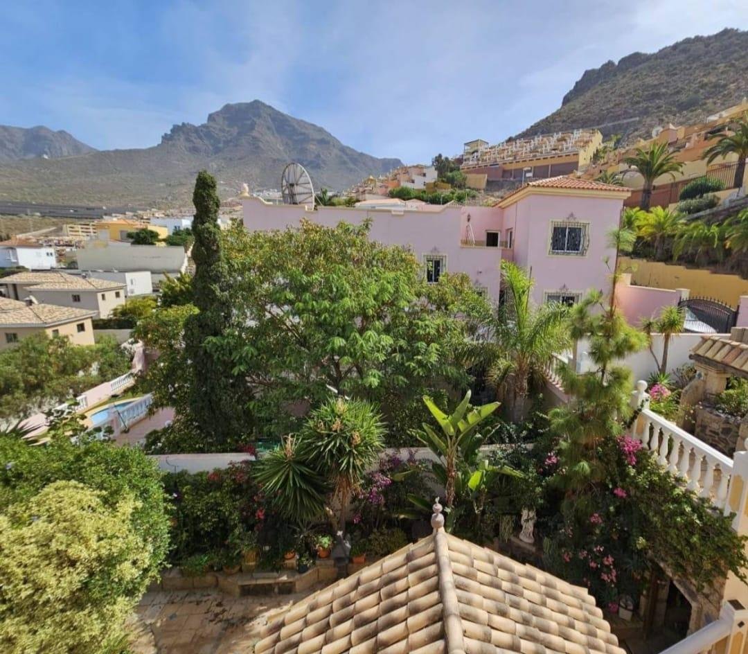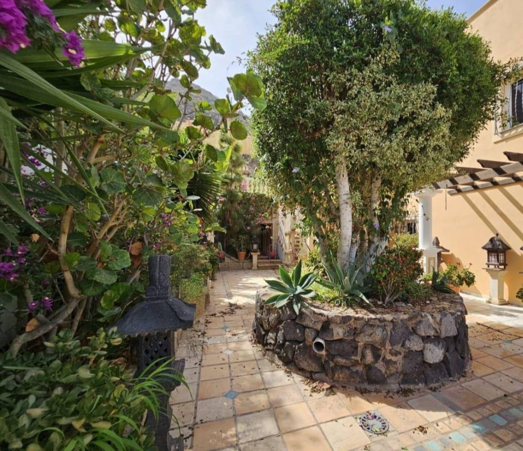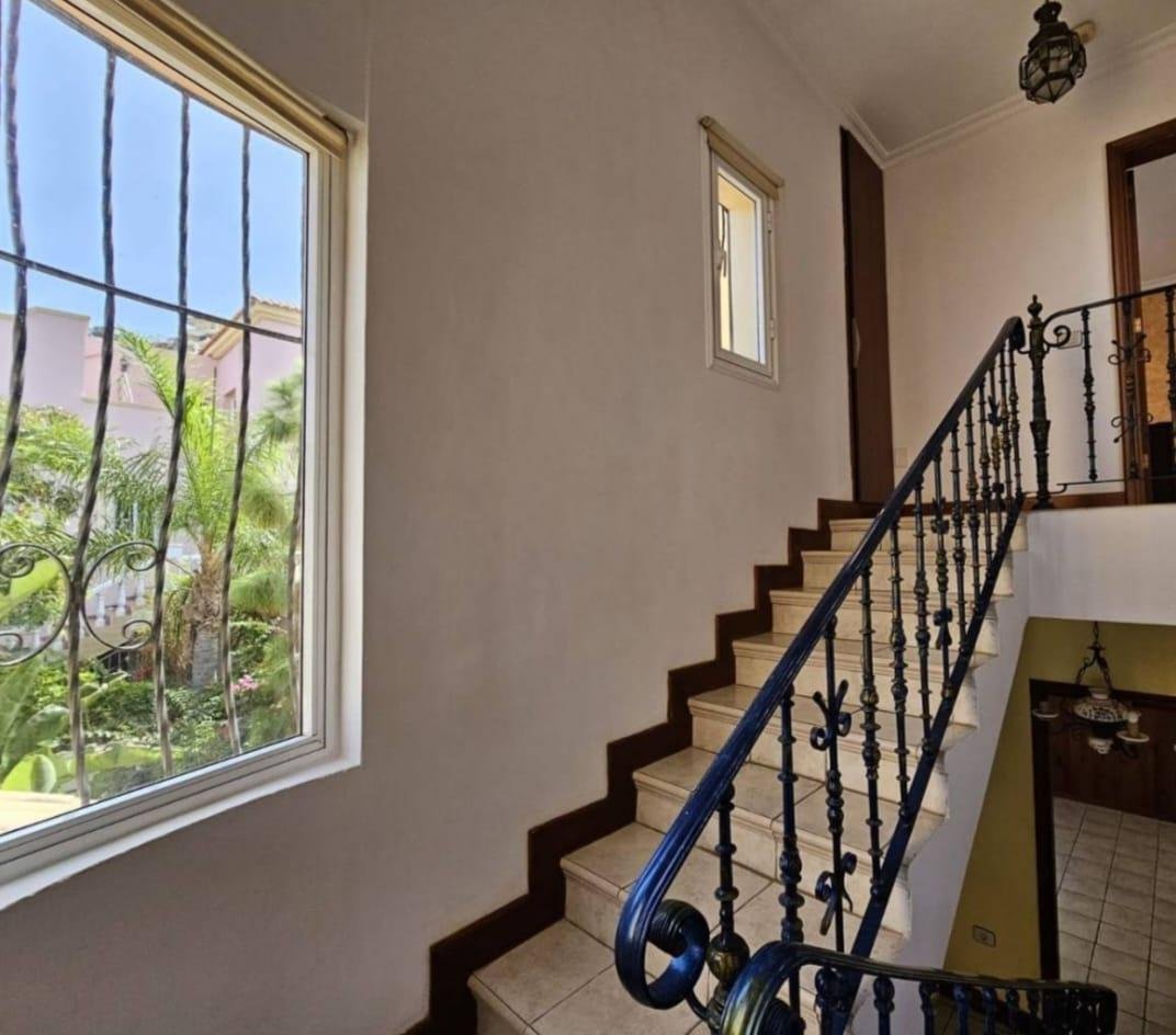 En venta casa independiente de 351 m2 en la zona de Roque del Conde. Se encuentra rodeada de jardines a diferentes niveles, y en una de las terrazas la piscina. Entrando a la vivienda tenemos un pequeño recibidor a mano derecha, el salón con salida a una terraza con vistas despejadas, donde se puede ver la zona ajardinadas y la piscina. Este salón está comunicado con el comedor. Justo en frente de la puerta de entrada, la cocina muy amplia y con una zona de almacenaje, está comunicada con el comedor. Bajamos una planta y tenemos una zona amplia de espacio de almacenaje y otra al lado aprovechando el hueco de la escalera, y un aseo que comparte con la planta principal. Vamos subiendo a la siguiente planta y ya a en esta tenemos dos dormitorios amplios con armarios empotrados y un baño completo. Subimos otro piso más dormitorio principal con baño en suite y zona de vestidor, que tiene salida a una terraza que lo bordea completamente. Siguiente planta otro dormitorio amplio con armarios y baño en suite, desde donde accedemos a la planta de azotea con vistas despejadas.