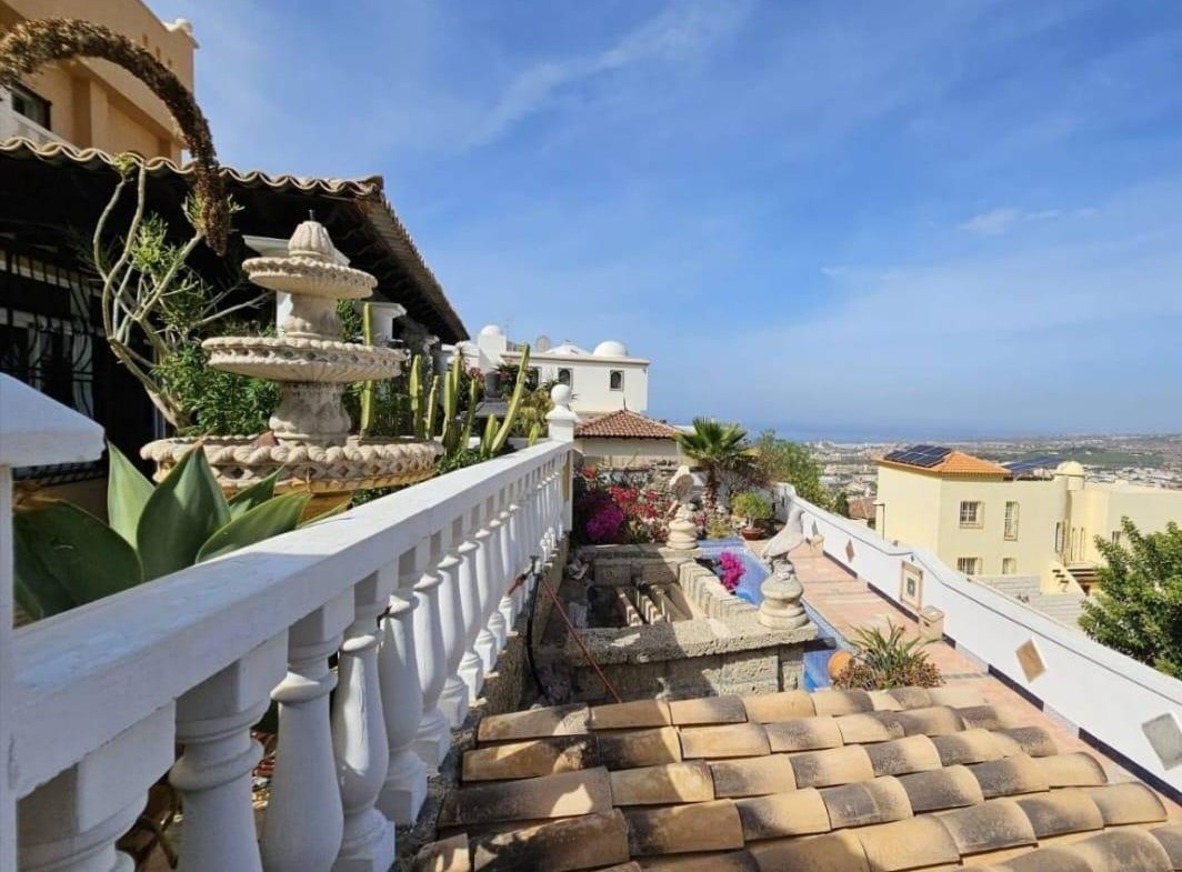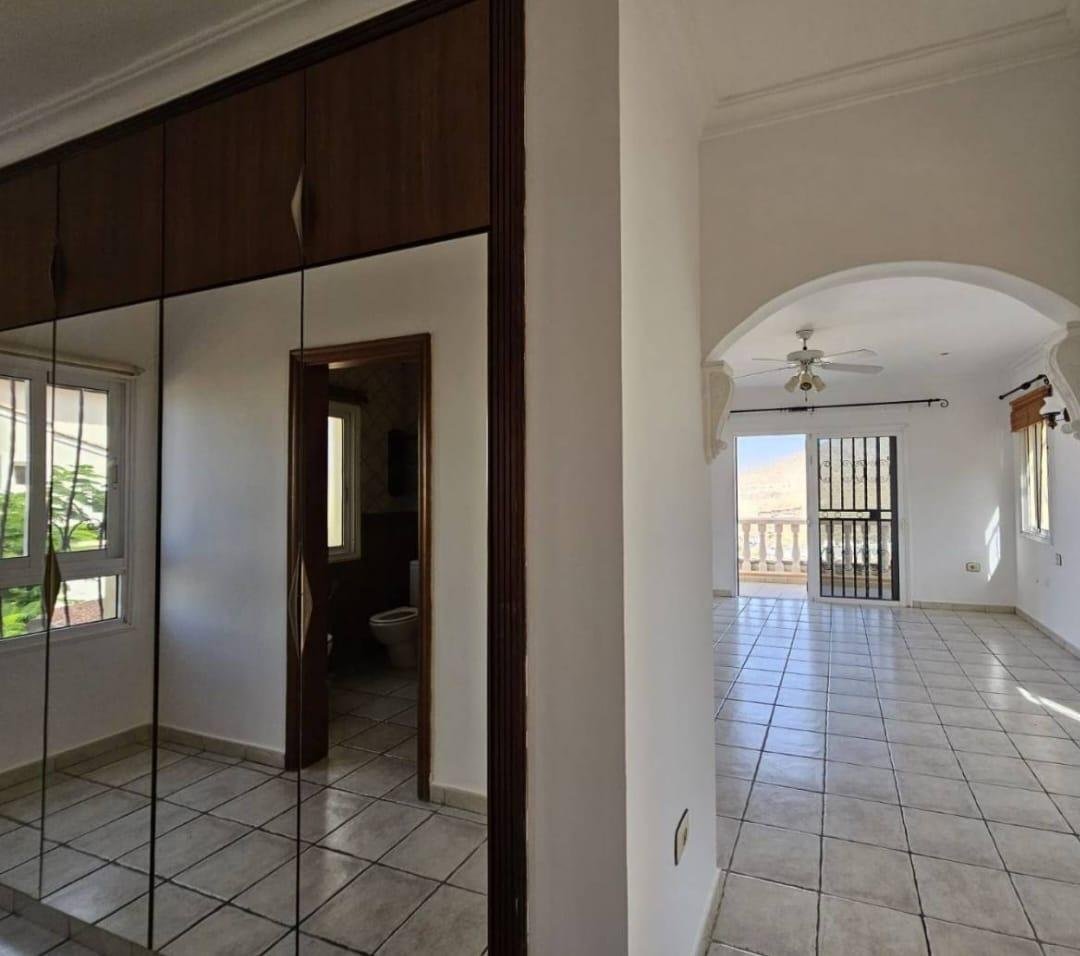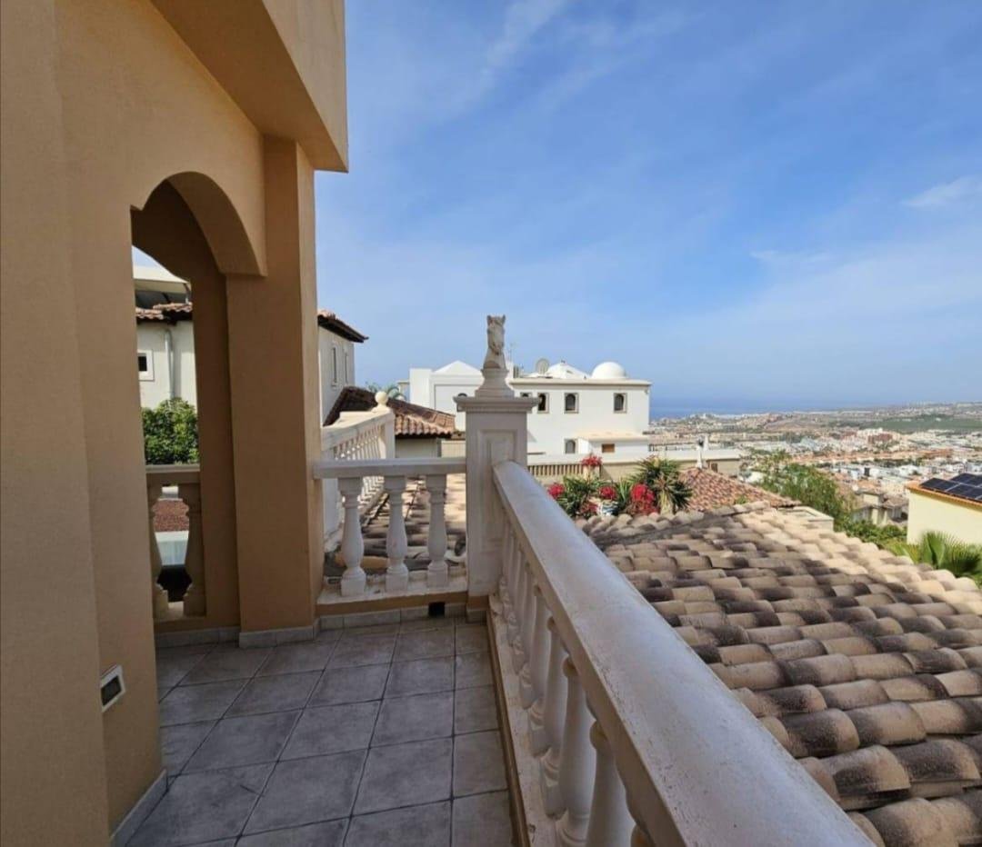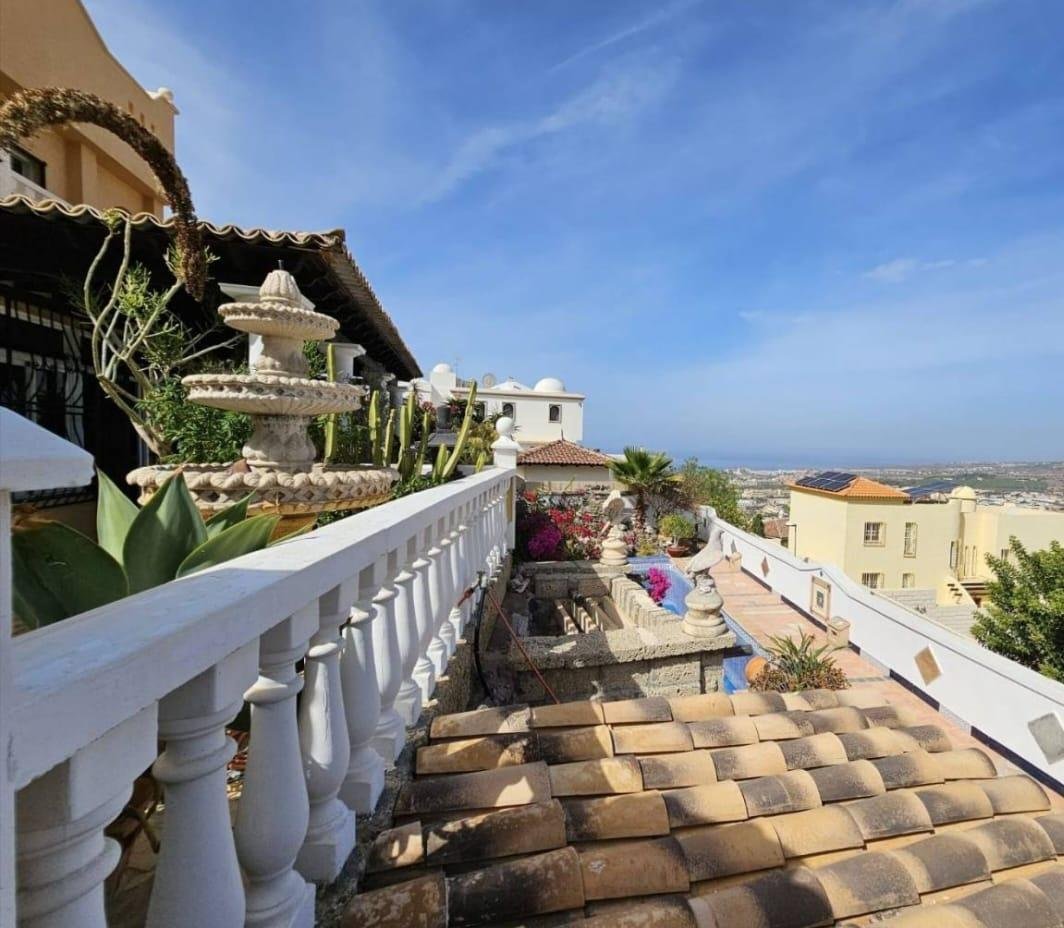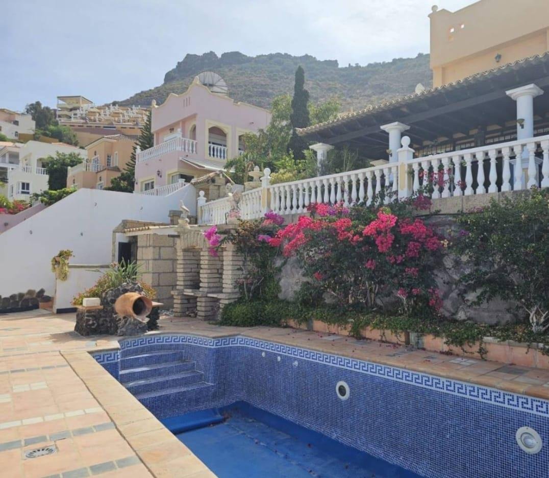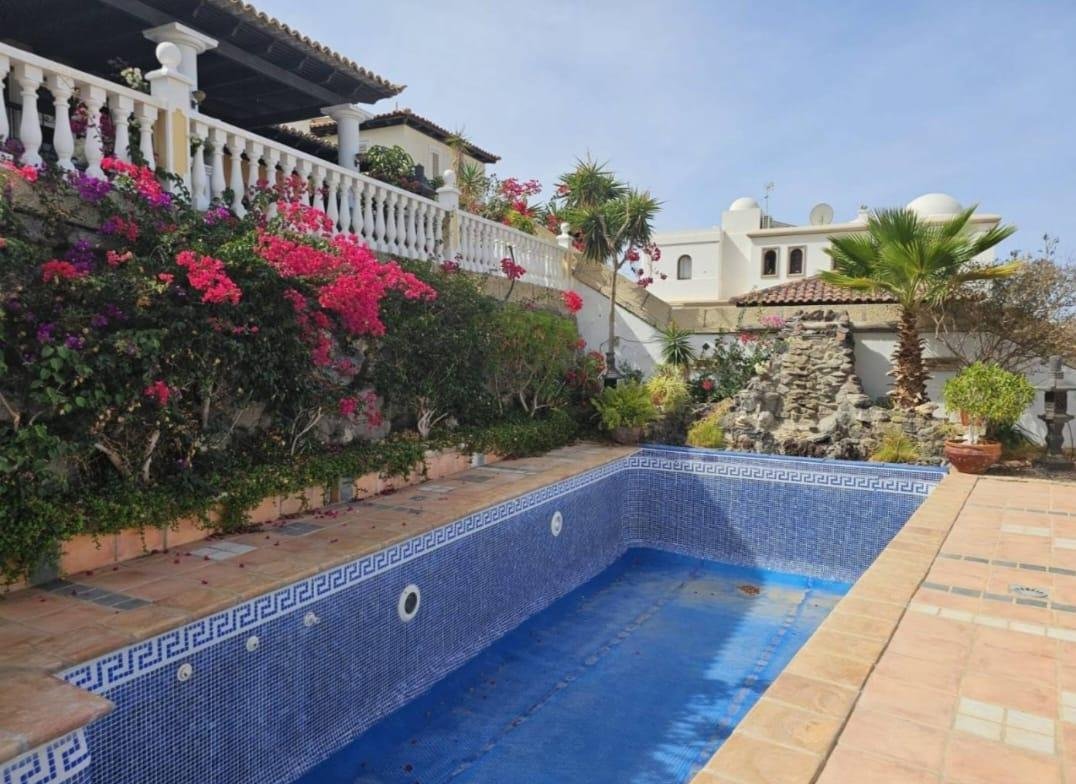 En venta casa independiente de 351 m2 en la zona de Roque del Conde. Se encuentra rodeada de jardines a diferentes niveles, y en una de las terrazas la piscina. Entrando a la vivienda tenemos un pequeño recibidor a mano derecha, el salón con salida a una terraza con vistas despejadas, donde se puede ver la zona ajardinadas y la piscina. Este salón está comunicado con el comedor. Justo en frente de la puerta de entrada, la cocina muy amplia y con una zona de almacenaje, está comunicada con el comedor. Bajamos una planta y tenemos una zona amplia de espacio de almacenaje y otra al lado aprovechando el hueco de la escalera, y un aseo que comparte con la planta principal. Vamos subiendo a la siguiente planta y ya a en esta tenemos dos dormitorios amplios con armarios empotrados y un baño completo. Subimos otro piso más dormitorio principal con baño en suite y zona de vestidor, que tiene salida a una terraza que lo bordea completamente. Siguiente planta otro dormitorio amplio con armarios y baño en suite, desde donde accedemos a la planta de azotea con vistas despejadas.